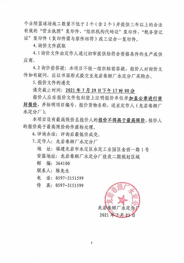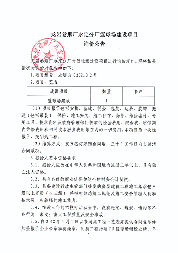 龍巖卷煙廠永定分廠籃球場建設項目詢價公告