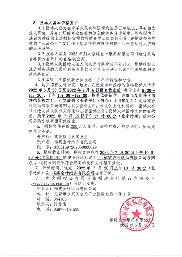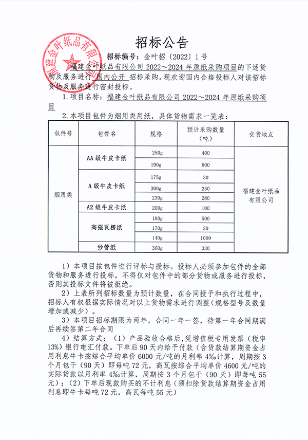 金葉紙品2022—2024年度原紙采購項目招標公告