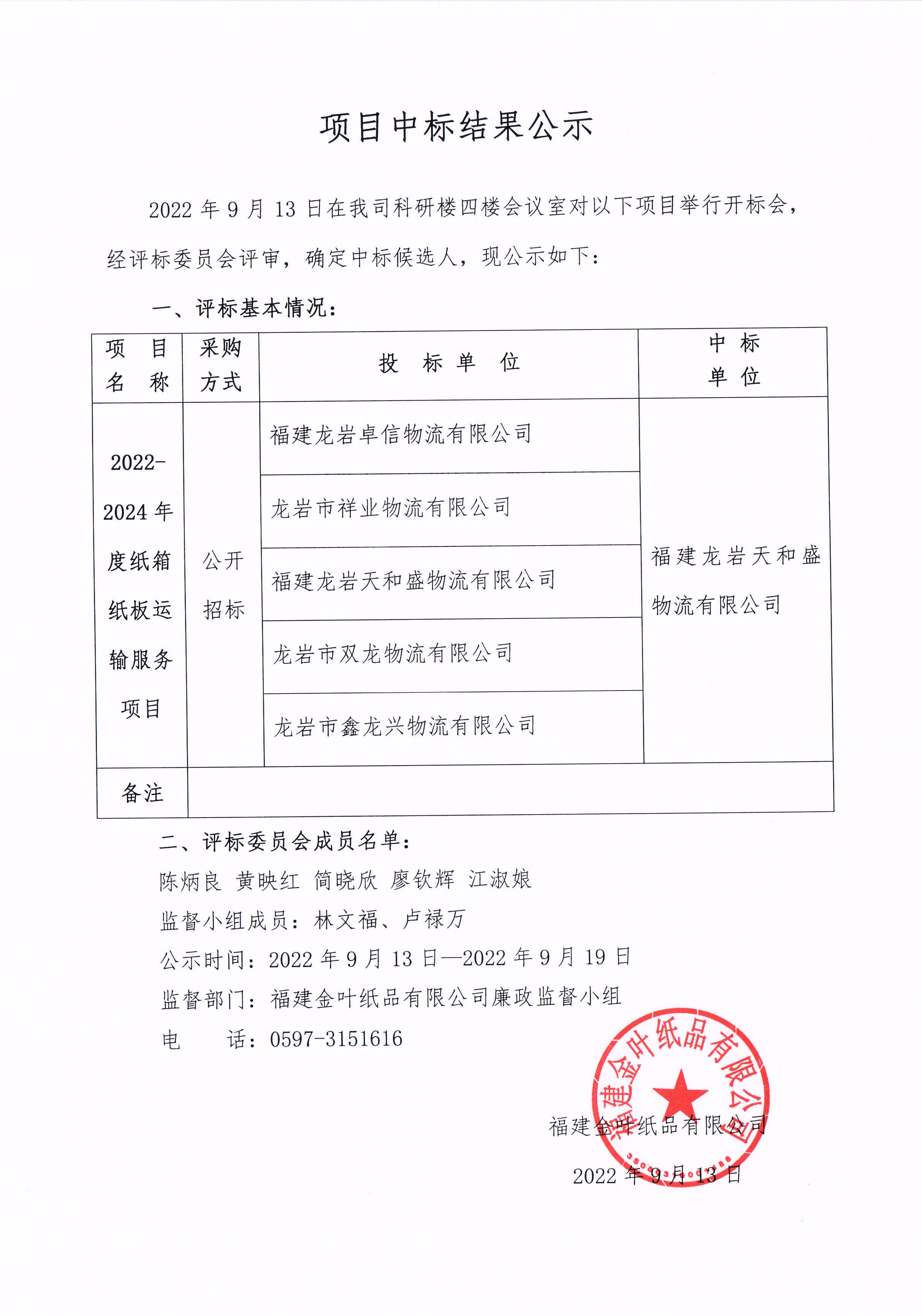 2022-2024年度紙箱紙板運輸服務項目中標結果公示