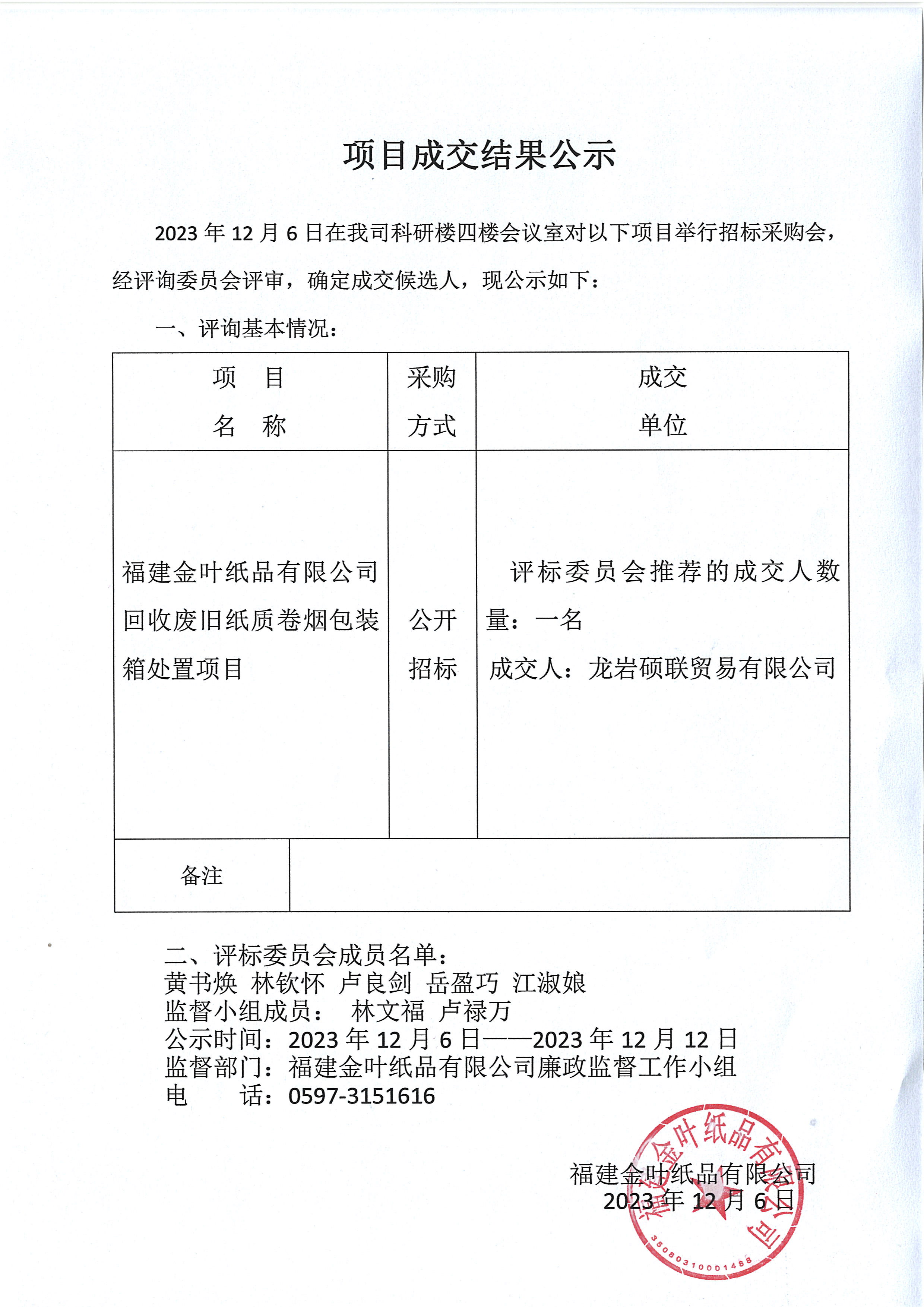 項目成交結果公示